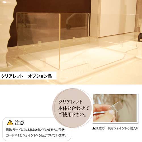 クリアレット 飛散ガード価格: 4,900円レビュー評価: 0.0 レビュー数:0 クリアレットオプション品、飛散防止ガードです。男の子用の排泄物飛散を防ぐ囲いです。本体と同じ透明ですので、サイズほど大きく感じさせません。本体への取り付けはとても簡単です。デザインにこだわるオーナー様に支持されています。生産国 台湾メーカー OFT CORPORATION サイズ幅58×奥41.5×高20cm/重量 (約)1kg材質透明アクリル樹脂メーカーOFT |